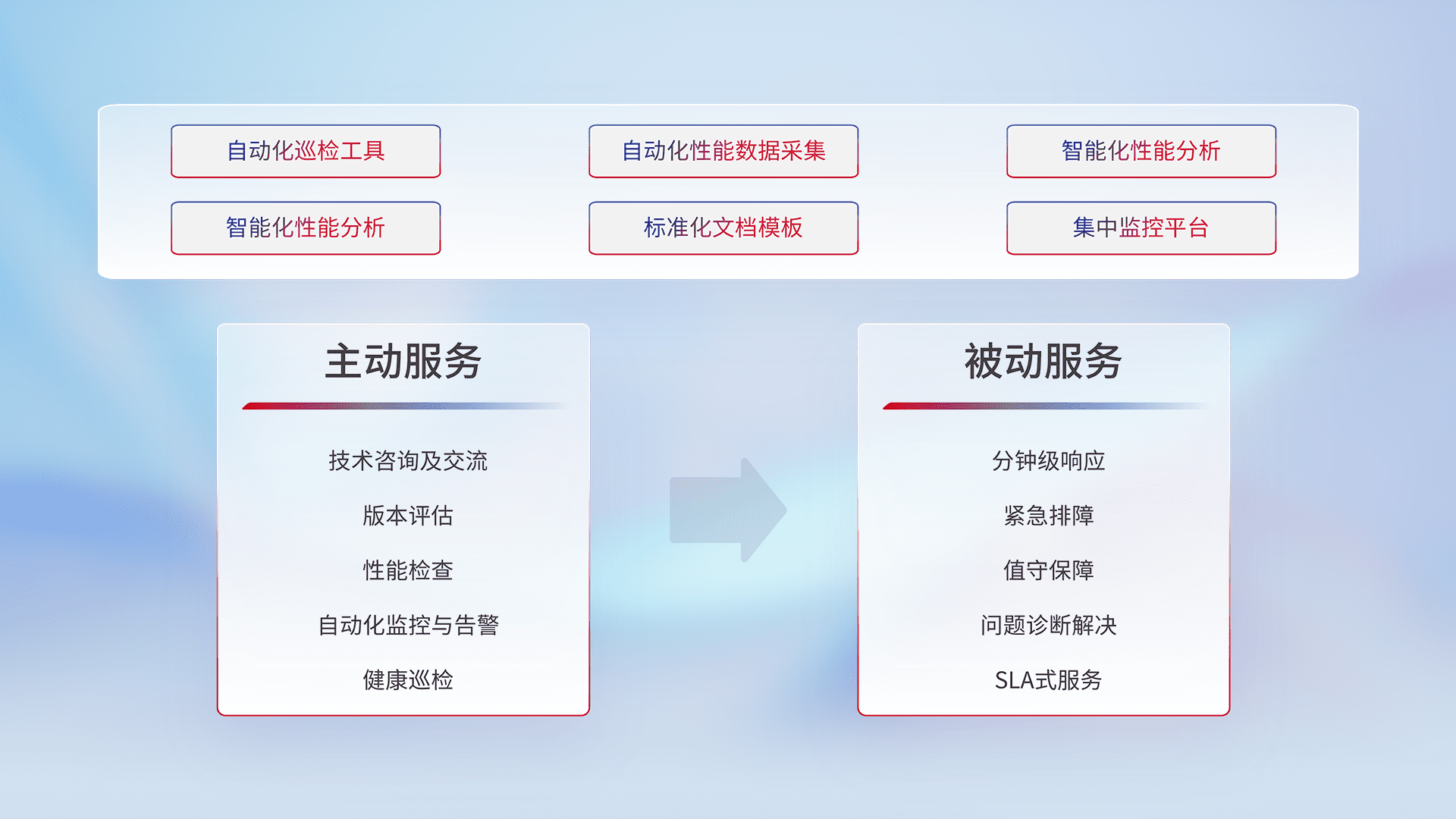 智能化工具和标准化文档,,保障服务质量,,,,提供主动服务(包含技术咨询、、、、版本评估、、、性能检查、、、自动化监控与告警、、、、健康巡检)和被动服务包含(分钟级响应、、、紧急排障、、、值守保障、、问题诊断解决、、SLA服务)。。